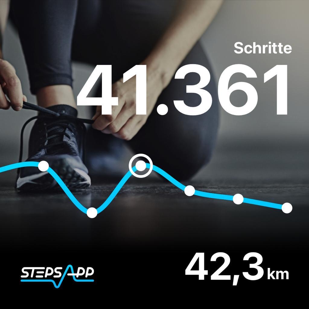 Schrittezähler „Steps-App“ mit dem Tagesrekord von 42 km bei allerdings auch 41.000 Schritten. Ich denke es kann eine Toleranz von ca. 10 % abgezogen werden, womit ich bei ca. 38km / Tagesmarsch angekommen bin.