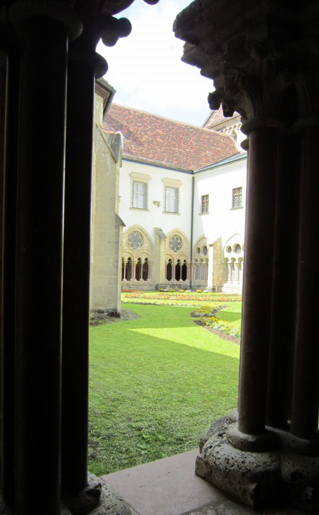 Kreuzgang des Zisterzienser-Klosters in Wien (Stift) mit Blick auf den Klostergarten.